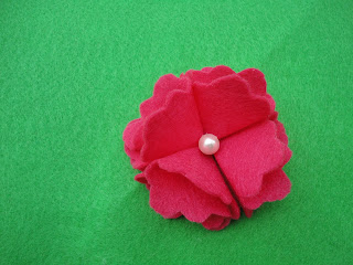 I used the template to cut out five flowers out of felt. One of the flowers is used as the base and the other four are glued to it as petals. I put a little bit of glue in the middle and folded each flower in half. Then put a little glue in the middle of the half and fold it in half again. Next, glue the four folded flowers to the base flower.